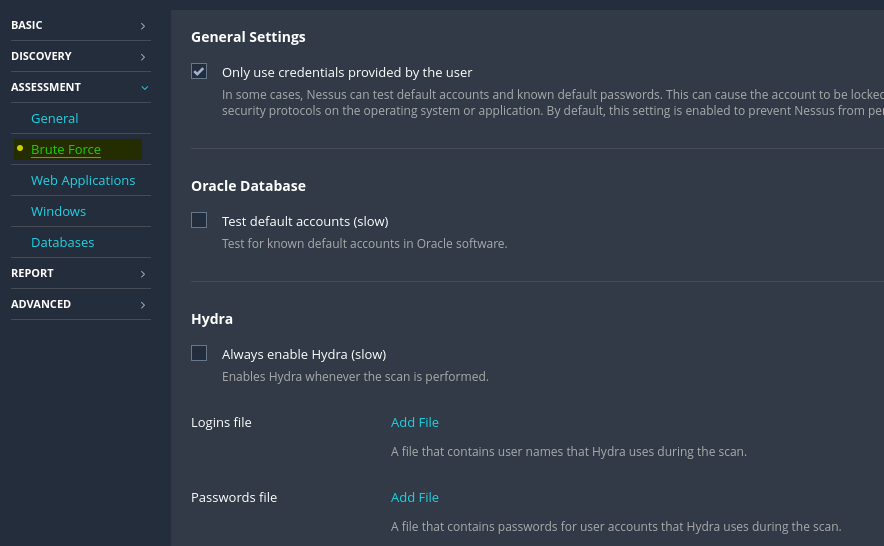 If desired, Nessus offers the option to authenticate against discovered applications and services using provided credentials, particularly when running a credentialed scan. Alternatively, if credentials are not available, Nessus can perform a brute-force attack using the provided username and password lists. This approach enhances the depth of the scan by allowing Nessus to access and evaluate additional information within the system, providing a more comprehensive security assessment.