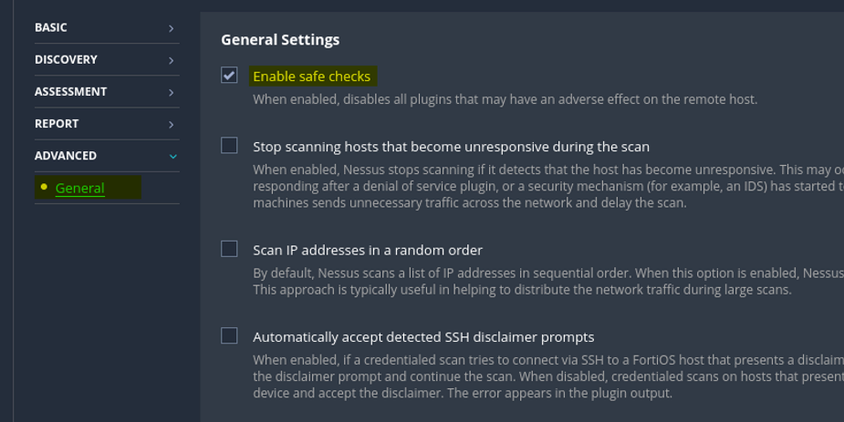 On the Advanced tab, safe checks are enabled by default in Nessus. This ensures that checks which may potentially harm the target device or network are avoided. Additionally, users have the option to adjust scan behavior based on network conditions. For instance, Nessus can slow down or throttle the scan if network congestion is detected. Furthermore, users can configure Nessus to cease scanning hosts that become unresponsive. Another option available is to instruct Nessus to scan the target IP list in a random order, enhancing unpredictability and security measures.
