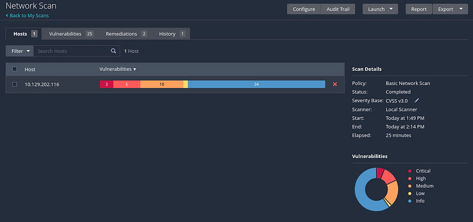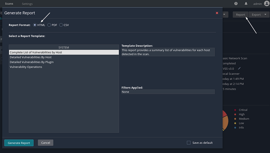 Once a scan is completed, users have the option to export a report in various formats including .pdf, .html, or .csv. In the .pdf and .html reports, users can choose between an Executive Summary or a custom report. The Executive Summary report provides a comprehensive overview, listing hosts along with the total number of vulnerabilities discovered per host. Users can access detailed information such as severity, CVSS score, plugin number, and issue name by clicking on the “Show Details” option. Each discovered issue’s plugin number contains a link to the full plugin writeup from the Tenable plugin database. The PDF format is convenient for sharing scan results.
