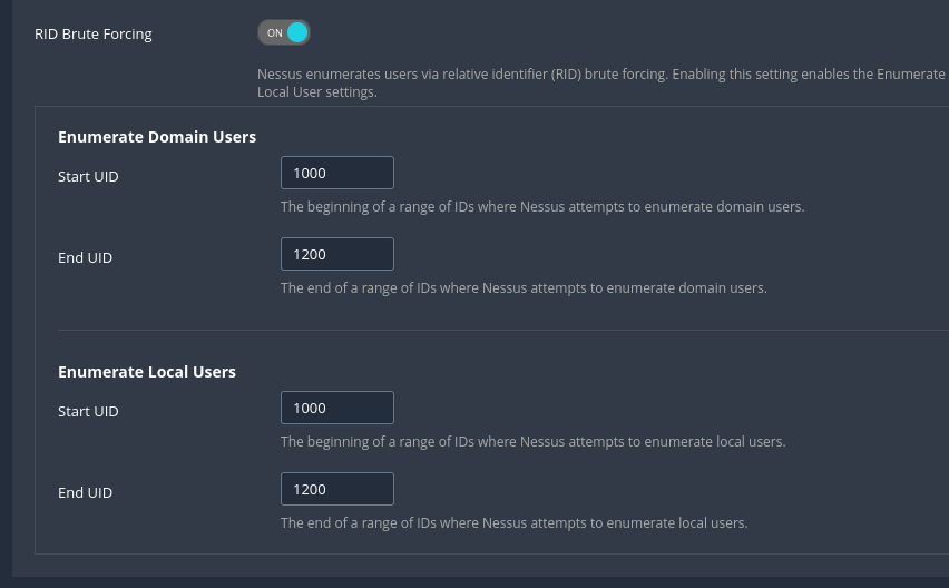 If we opt to perform RID Brute Forcing, we can set the starting and ending UIDs for both domain and local user accounts: