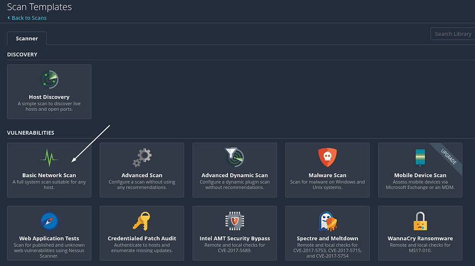 To set up a new Nessus scan, click “New Scan” and choose your desired scan type. Scan templates are categorized into three main groups: Discovery, Vulnerabilities, and Compliance. Within these categories, you’ll find options like a basic Host Discovery scan for spotting live hosts and open ports, or more specialized scans such as Basic Network Scan, Advanced Scan, Malware Scan, and Web Application Tests. Additionally, there are scans tailored to specific CVEs (Common Vulnerabilities and Exposures) and audit & compliance standards. For detailed descriptions of each scan type, refer to the provided documentation.