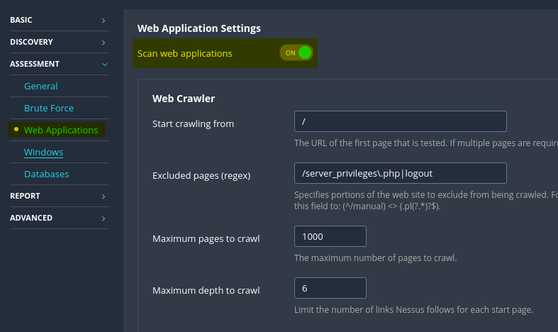 Under the Assessment category, users can opt to enable web application scanning as needed. This feature allows for the customization of a user agent and various other web application scanning options. For instance, users can specify a URL for Remote File Inclusion (RFI) testing, enhancing the comprehensiveness of the scan and ensuring thorough security assessment of web applications.